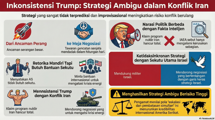 Dikutip dari berbagai sumber, sejumlah pengamat internasional menilai kebijakan Trump dalam konflik ini menunjukkan pola yang tidak konsisten. Pendekatan yang digunakan dinilai menggabungkan tekanan militer dengan dorongan diplomasi dalam waktu yang sangat singkat.