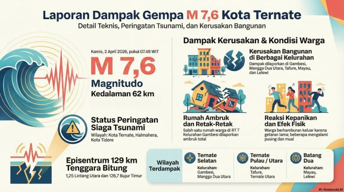 MalutTrend.Com, TERNATE – Gempa dengan magnitude 7,6  yang mengguncang Maluku Utara dan Sulawesi Utara, Kamis (2/4/2026) pagi dilaporkan menimbulkan dampak kerusakan bangunan diwilayah  di Kota Ternate.