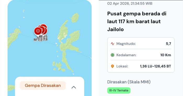 Gempa Kembali Guncang Ternate, Magnitudo 5,7 Berpusat di Laut 117 Km dari Jailolo